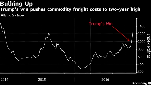 Publiée le 22 Nov 2016 - 0 commentairesLe transport de matières premières a vu ses coûts multiplier par 6 en un an. C'était l'argument chéri de ceux qui attendent la fin du monde... zut ! Perdu !